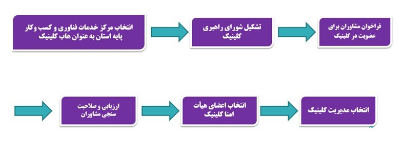 به منظور ساماندهی تیمهای توانمندساز و همچنین با هدف بهرهگیری از ظرفیت مشاوران خبره به عنوان بازوی اجرایی چارچوب اجرایی راه اندازی کلینیک های کسب وکار تدوین و پس از تصویب در هیأت مدیره سازمان به شرکتهای استانی ابلاغ گردید. مطابق ساختار اجرایی پیش بینی شده ایجاد این کلینیک با فراخوان مشاوران و ارائه دهندگان خدمات کسب وکار در سطح استان و برگزاری انتخابات انجام و به تناسب مشاوران شرکت کننده در فراخوان و انتخابات برگزار شده اعضای هیأت امنا کلینیک انتخاب و فعالیت مینمایند. در حال حاضر در 29 استان کلینیک های کسب وکار مشغول فعالیت میباشند.