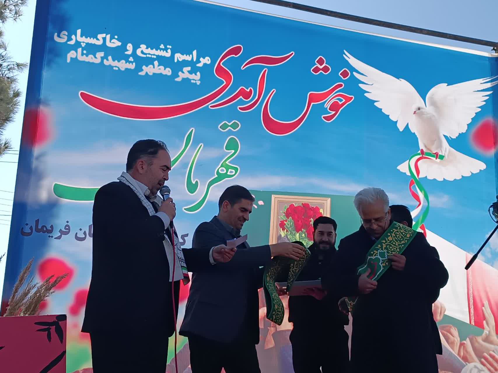 به گزارش روابط عمومی سازمان صنایع کوچک و شهرک‌های صنعتی ایران، پیکر مطهر این شهید گمنام، پس از حضور و استقبال در ۶۵ نقطه استان خراسان رضوی و شهرستان فریمان، بر روی دستان مردم شریف فریمان و مشهد مقدس، کارگران و صنعتگران شهرک صنعتی کاویان  تشییع شد و پس از انجام تشریفات نظامی و دینی، در یادمانی واقع در ورودی شهرک صنعتی آرام گرفت.