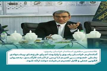 مظفری ادامه داد: ما آمادگی داریم خراسان رضوی را به عنوان پایلوت اجرای طرح‌های پیشنهادی شما معرفی کنیم تا پس از اثبات کارآمدی، به عنوان یک الگو در هیئت دولت ارائه شود.